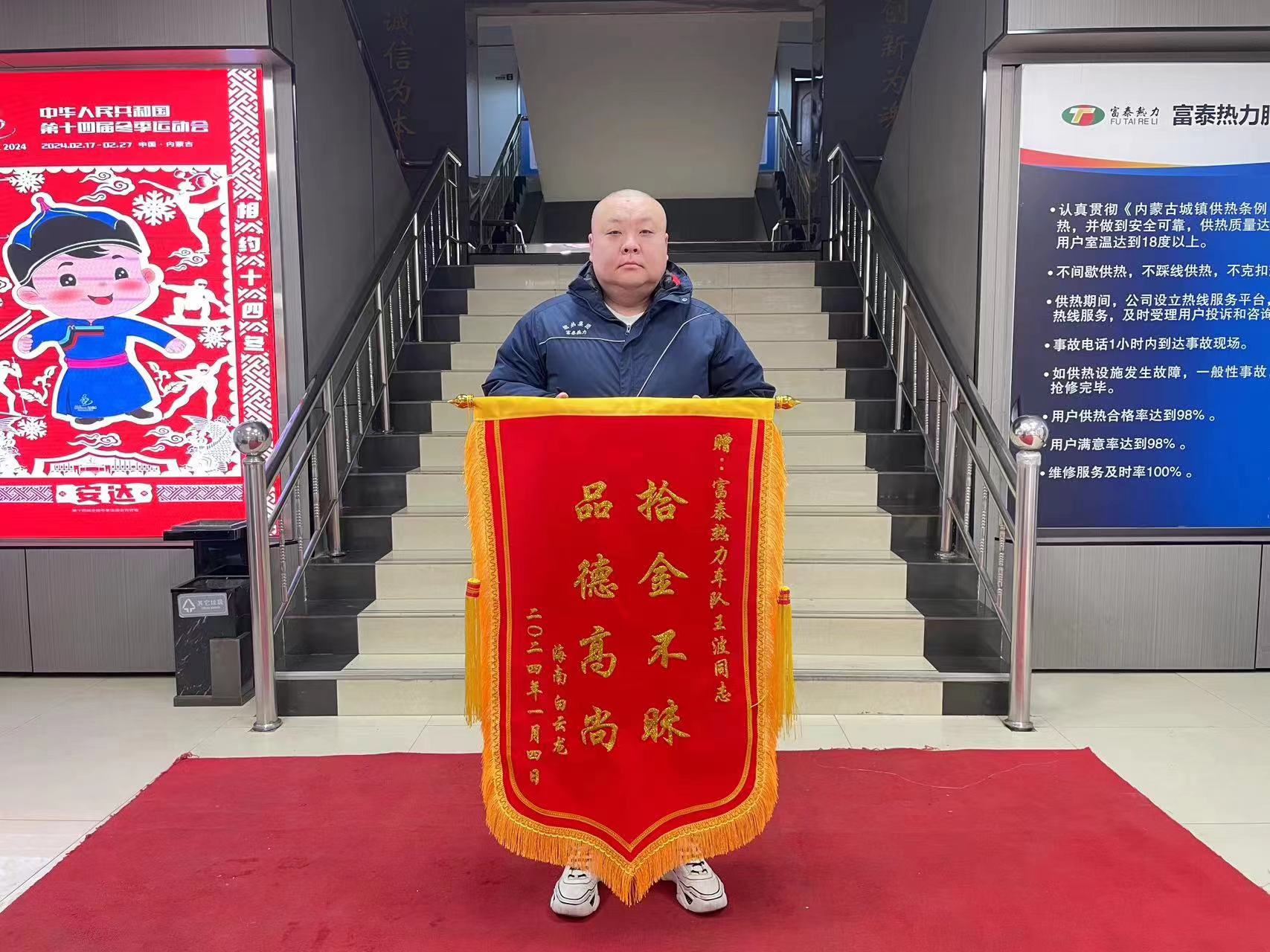 1月9日,海南省來(lái)呼辦事的白云龍先生將一面寫有“拾金不昧 品德高尚”的錦旗送到了富泰熱力公司,對(duì)公司綜合管理部員工王波拾金不昧的暖心行為表示真摯的感謝。