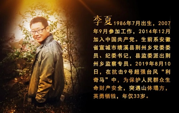 影片中,李夏同志生前是安徽省宣城市績(jī)溪縣荊州鄉(xiāng)黨委委員、紀(jì)委書記,縣監(jiān)委派出荊州鄉(xiāng)監(jiān)察專員。他堅(jiān)定理想信念、堅(jiān)守初心使命,十余年來,始終奮戰(zhàn)在脫貧攻堅(jiān)、鄉(xiāng)村振興、正風(fēng)肅紀(jì)第一線。他堅(jiān)持原則、一身正氣,在紀(jì)檢監(jiān)察工作崗位上,敢于較真碰硬,鐵面執(zhí)紀(jì)執(zhí)法,突出整治群眾身邊腐敗和作風(fēng)問題,推動(dòng)全面從嚴(yán)治黨不斷向基層延伸。2019年8月10日,在抗擊臺(tái)風(fēng)利奇馬時(shí)以身殉職,年僅33歲。