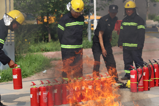 項目處經(jīng)理李銳詳細介紹了四公斤手提干粉滅火器的使用方法和注意事項。隨著第一著火點煙感報警器的預(yù)警聲,各組人員統(tǒng)一指揮,高效協(xié)調(diào),臨危不亂,在實戰(zhàn)中鍛煉了火場組織疏散程序以及火場逃生、自救互救、搶險滅火的能力。