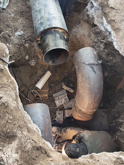 9月27日,展東路與海拉爾大街十字路口的一次網(wǎng)跑水,開挖后發(fā)現(xiàn)相鄰的排污管道有破損,供熱管道浸泡在污水中,腐蝕嚴重,需要先處理好污水管道才能搶修熱力管道,增大了施工難度。經(jīng)過幾次嘗試,最終決定對漏點處進行線位改遷,重新鋪設管道。經(jīng)過10天持續(xù)不斷、緊張輪流作業(yè),于10月6日中午,終于修復管網(wǎng)漏點,保證了管網(wǎng)注水試壓。