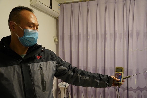 在20號樓3單元6樓的住戶家中,劉婷用手摸了摸用戶家的地板磚,通過人體的直觀感受,發(fā)現(xiàn)用戶家地暖存在散熱不均勻的現(xiàn)象??头芗矣脤I(yè)的測溫儀和熱成像儀,進行了測溫。經(jīng)檢測,該用戶家各房間平均溫度均在23℃以上。用戶說,家中較冷的房間是廚房,客服管家又針對廚房進行了測溫,發(fā)現(xiàn)室溫要比其他房間溫度低一些,但熱成像儀測得的結(jié)果與其他房間一致。經(jīng)過觀察與分析,發(fā)現(xiàn)用戶家廚房與陽臺間的隔斷是一扇落地大玻璃門,保溫效果較差,導致廚房溫度低于其他房間。聽了工作人員的講解,用戶也表示了認可,對我們的排查結(jié)果及服務態(tài)度表示滿意。