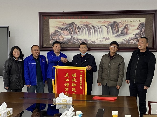 11月29日,西黑河村村長(zhǎng)胡滿貴一行四人來(lái)到市城市燃熱集團(tuán)公司將一面寫著"暖流融通西黑河真心譜寫和諧曲"的錦旗贈(zèng)送呼市城發(fā)供熱公司,對(duì)城發(fā)供熱公司用心盡力,精心施工,保障供暖,傾情服務(wù)表達(dá)了誠(chéng)摯的謝意!集團(tuán)公司總工程師胡月在鄭重地接過(guò)這份來(lái)自村民的認(rèn)可。