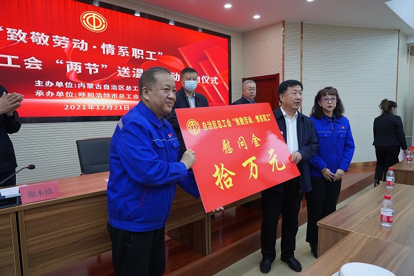 隨后,自治區(qū)總工會(huì)副主席傲木格同志發(fā)表了講話。自治區(qū)總工會(huì)黨組書(shū)記張慧宇宣布全區(qū)工會(huì)"兩節(jié)"送溫暖活動(dòng)正式啟動(dòng),并為市城市燃熱集團(tuán)送上了十萬(wàn)元的慰問(wèn)金。