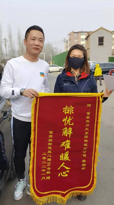 玉泉分公司員工喬娟娟在富貴國(guó)際花園走訪時(shí)得知小區(qū)二期37號(hào)樓進(jìn)入11月份后整棟樓就出現(xiàn)溫度偏低現(xiàn)象,她和同事們迅速開始排查原因。該棟樓共有5層10戶熱用戶,他們用了一天時(shí)間逐層逐戶對(duì)熱用戶家中的濾網(wǎng)進(jìn)行了清洗,但是效果不是很理想。于是他們又對(duì)負(fù)一層主管網(wǎng)的除污器進(jìn)行了清洗,一系列的操作完成后又是整整一天,第二天回訪熱用戶時(shí)得知溫度只提升了2度,為了讓熱用戶溫暖過(guò)冬,喬娟娟又和同事們對(duì)該棟樓主管道的所有支管進(jìn)行了沖洗,再次回訪熱用戶時(shí)發(fā)現(xiàn),該棟樓其他熱用戶家中溫度都很好,只有301熱用戶家中的溫度還是偏低,為了找到原因,喬娟娟和同事們對(duì)用戶家中的暖氣管道敷設(shè)情況進(jìn)行了測(cè)量,再次沖洗了管道,同時(shí)積極聯(lián)系到已經(jīng)辦理停供的401熱用戶進(jìn)行了復(fù)供,該熱用戶家中溫度偏低問題得到解決。"排憂解難暖人心"為了表達(dá)感謝之情,1月9日,301熱用戶聯(lián)系到了正在小區(qū)走訪的喬娟娟,親手遞給她一面錦旗。
