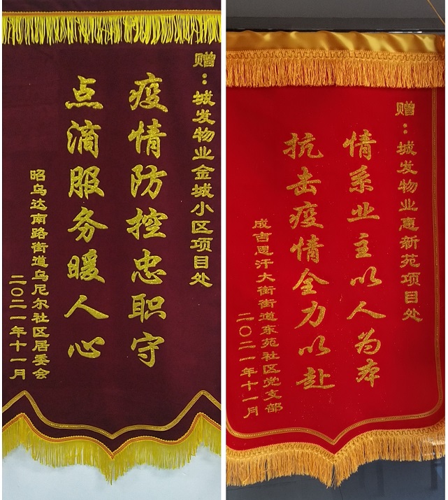 2021年城發(fā)物業(yè)公司年度取得了可喜成績,2021年被呼和浩特市物業(yè)管理協(xié)會評為2021年度先進單位、管理的金城小區(qū)項目被呼和浩特市物業(yè)管理協(xié)會評為2021年度呼和浩特市物業(yè)管理示范項目,史濤、郝曉東、范宇昆、董美麗四名同志被呼和浩特市物業(yè)管理協(xié)會評為2021年"抗議勇士"與"最美物業(yè)人","金城小區(qū)"、"陽光美居"、"惠新苑"項目處分別被賽罕區(qū)烏尼爾社區(qū)居委會、富力社區(qū)、新城區(qū)東苑社區(qū)居委會贈送"疫情防控忠值守,點滴服務暖人心"錦旗和榮譽證書。