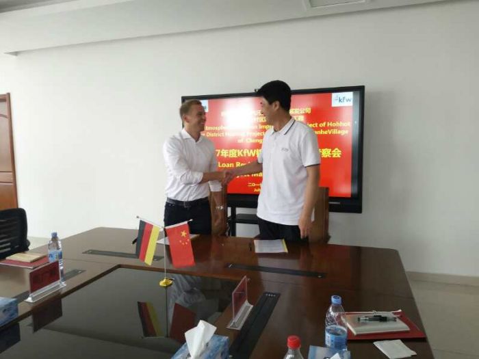 城發(fā)公司副總經(jīng)理吳利勤向考察團(tuán)一行詳細(xì)介紹了項(xiàng)目進(jìn)展、環(huán)境保護(hù)、設(shè)備采購和計(jì)劃投資等方面情況,并對(duì)考察團(tuán)提出的問題進(jìn)行了詳細(xì)認(rèn)真回答。隨后吳利勤副總經(jīng)理全程陪同考察團(tuán)實(shí)地考察橋靠、三合村熱源廠鍋爐車間和部分熱力站;7月18日上午與德國復(fù)興信貸銀行(KFW)項(xiàng)目經(jīng)理Julian Schuetz先生簽訂了此次檢查調(diào)研備忘錄。考察團(tuán)對(duì)城發(fā)及當(dāng)前項(xiàng)目的建設(shè)實(shí)施情況給予了充分肯定和高度評(píng)價(jià)。