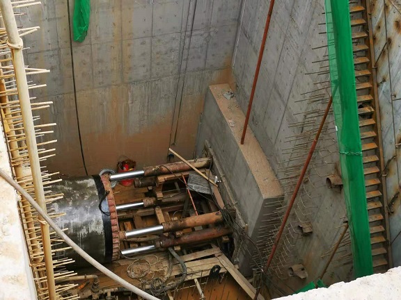 井底一臺頂管設備正在施工中。在沉井的上方,一臺泥漿分離器正在不停運行著,從分離器吐出來的沙土一會兒就堆成了小山,一臺小型挖掘機不停將沙土進行外運。兩根長長的管道深入了沉井底部。
