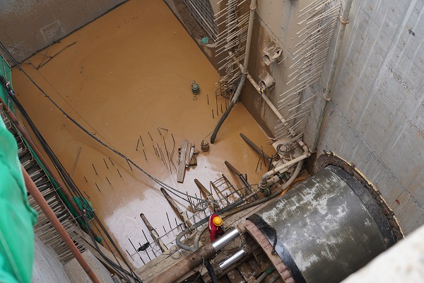 施工現場機器轟鳴,說話需要提高分貝。一進入施工現場,就看到前方有一個沉井,沉井20米深、13.4*7.3米間方,這個沉井是挖掘井,在河的對岸還有一個深15.5米的接收井。從沉井圍欄邊看井底,下邊的工作人員都顯得特別的渺小,20米深的井相當于6層樓高,恐高的人都不敢往下看。