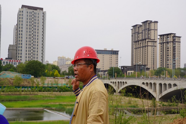 筆者來到成吉思汗大街與哈拉沁路交匯處的路口,遠遠就看見一臺重型吊車矗立在工地圍擋中,圍擋內就是跨越東河頂管工程的施工現場。