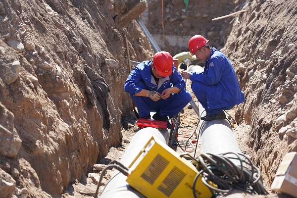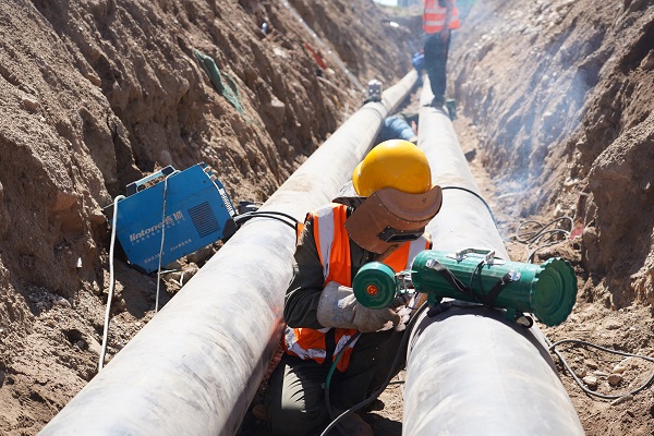 一個(gè)工人師傅,側(cè)身躺在兩個(gè)管道中間的狹小夾縫中,對(duì)管道進(jìn)行焊接。施工單位天津管道公司的段步雨向筆者介紹,"現(xiàn)在這個(gè)師傅做的是第二道工序,叫電焊造面。你看到這么長(zhǎng)的管子,都是一截一截焊接起來(lái)的,焊接要兩道工序,第一道是氬弧焊打底,就是在電弧焊的周圍通上保護(hù)氣體----氬氣,使焊材不能和空氣中的氧氣接觸,從而防止了焊材的氧化,所以第一遍要用氬弧焊,就是為了焊口不生銹,確保它的使用年限。氬弧焊完成后,為了管道外壁齊平,焊口更牢靠,再進(jìn)行第二遍電焊造面。"