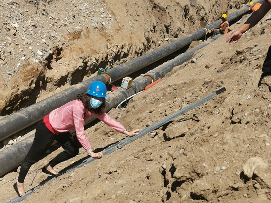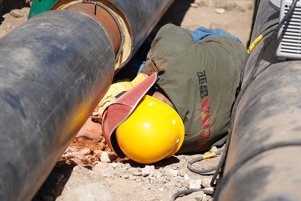 筆者帶好安全帽,也順著工人們下溝的唯一路徑----一個(gè)近乎垂直立在溝邊梯子下到溝里,每走一步,周圍的土就在"簌簌"的往下掉,筆者的心也跟著這些土渣心驚膽戰(zhàn)。來(lái)到管道溝里,兩根粗粗的管子并排向遠(yuǎn)方延伸去。管溝雖然深,但是并不寬,作業(yè)空間不大。